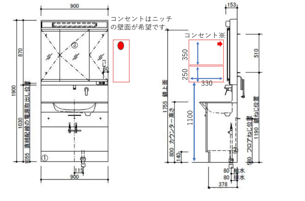 ↑は洗面の横にニッチを作って欲しいことを伝えるために作成した図です。このような感じで作成してました。これをベースに打ち合わせで大幅な修正をしてもらいました。